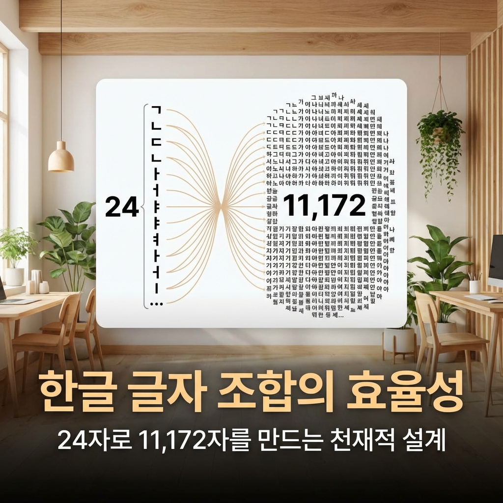 검색 설명: 한글은 24개 기본 글자로 11,172자를 조합하는 세계 유일의 자질문자예요. 상형과 가획 원리로 만들어진 과학적 문자의 효율성, 영어·한자·일본어와의 비교, 디지털 시대 강점까지 한글 조합 원리의 모든 것을 정리했어요.